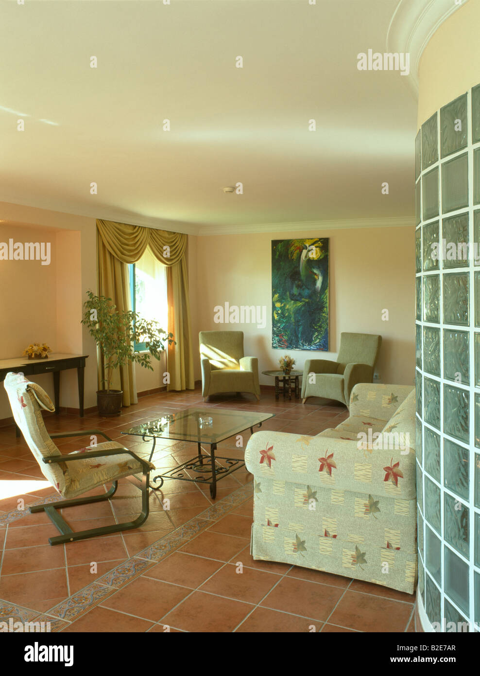 Modern terracotta floor tiles living room.